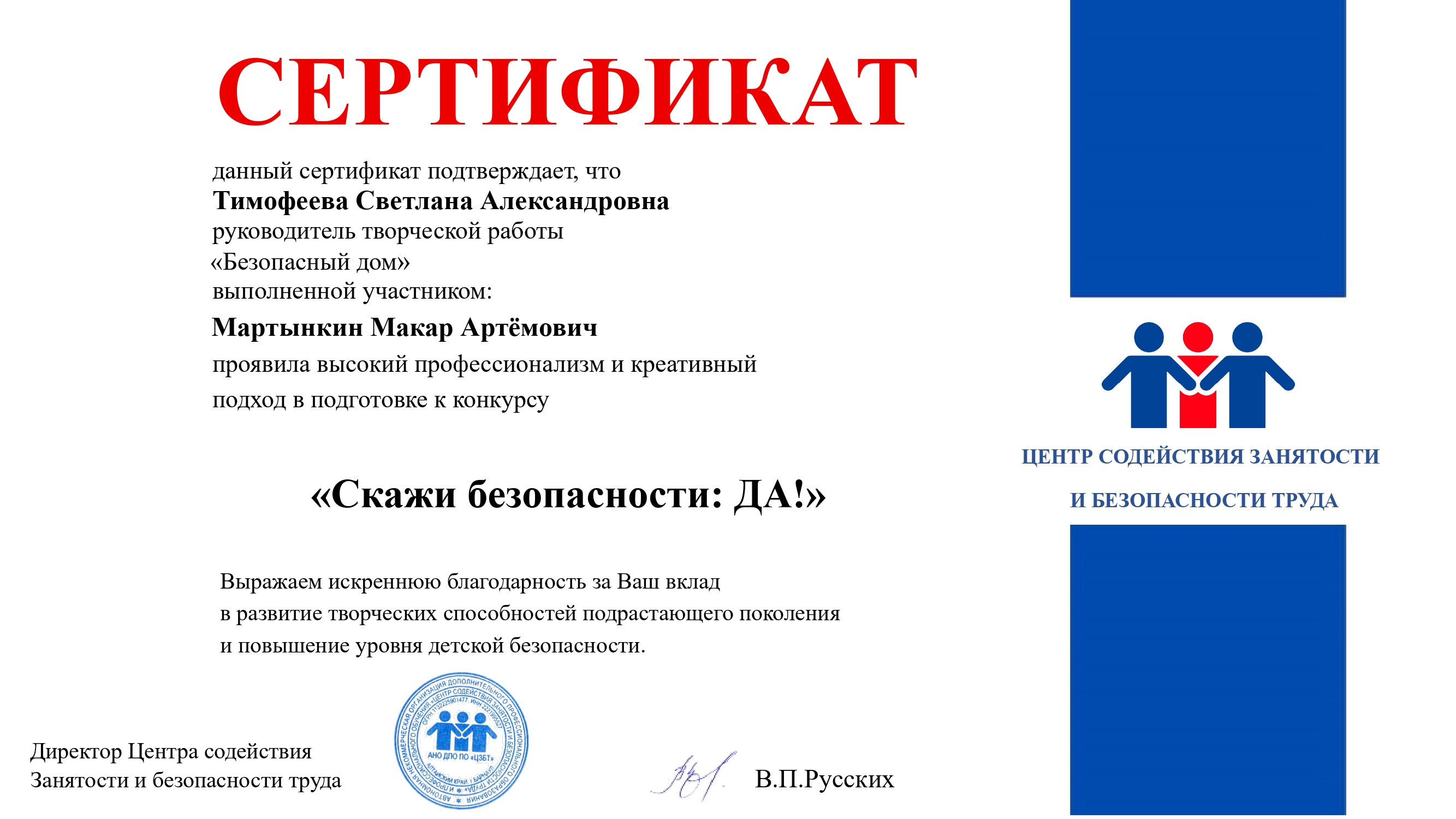 Благодарность за вклад в развитие творческих способностей подрастающего поколения и повышения уровня детской безопасности